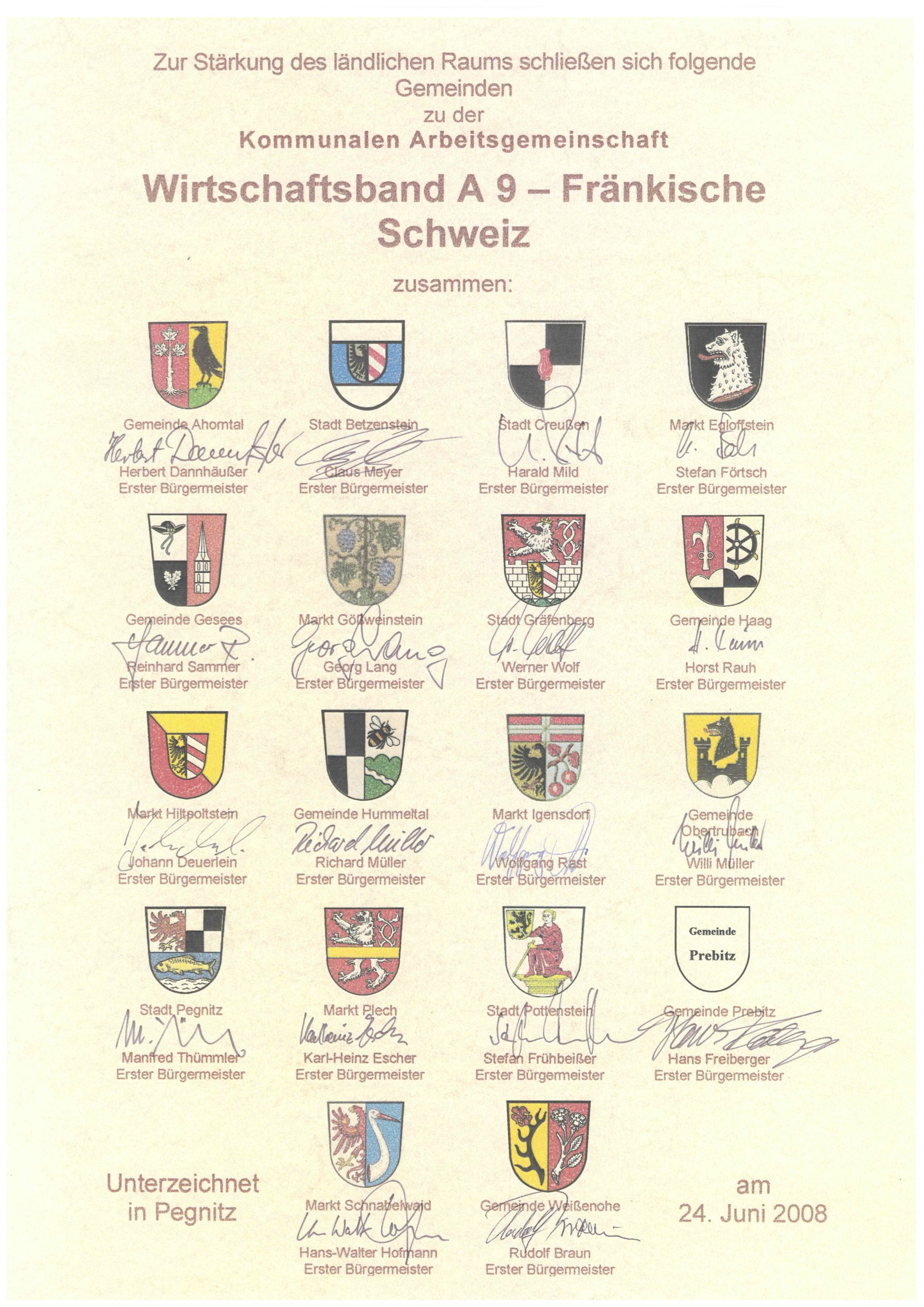 Am 24. Juni 2008 wurde die Kommunale Arbeitsgemeinschaft "Wirtschaftsband A9 Fränkische Schweiz" zur Stärkung des ländlichen Raumes gegründet.